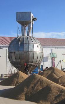 3、在烘干過程中,稻谷緩慢下落由頂部風機將稻谷從烘干機底部循環(huán)提入料風分離器,再由鎖風料管自然落入大球體內(nèi),球體內(nèi)稻谷在勻速運動中被烘干。
